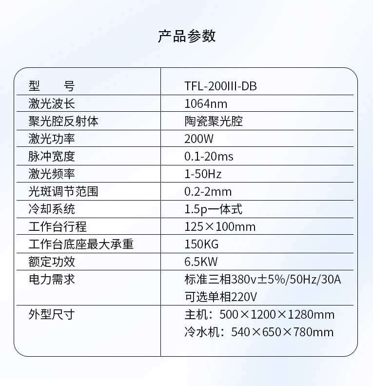 TFL-200Ⅲ-DB型模具激光焊機(jī)是通發(fā)激光公司在TFL-180Ⅲ的基礎(chǔ)進(jìn)行了改良,采用通發(fā)自主研發(fā)的二代精密單燈電源為燈泵浦驅(qū)動(dòng)電源,操作更方便。主機(jī)具備激光頭手搖升降與工作臺(tái)按鈕電動(dòng)升降實(shí)現(xiàn)焊接不同厚度模具的激光焊加工。本款機(jī)型更適用于各類(lèi)高精密注塑模具激光補(bǔ)焊,精密塑膠模具零件激光修補(bǔ),塑膠模具鈹銅零件激光燒焊;可對(duì)模具使用過(guò)程中出現(xiàn)的磨損進(jìn)行激光修復(fù);對(duì)機(jī)械加工失誤、電火花加工失誤,模具減膠設(shè)計(jì)變更等需要對(duì)模具修改,起到關(guān)鍵的作用,可彌補(bǔ)應(yīng)加工失誤造成的巨大損失。