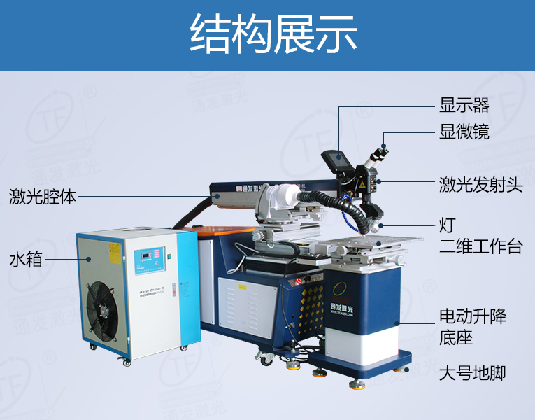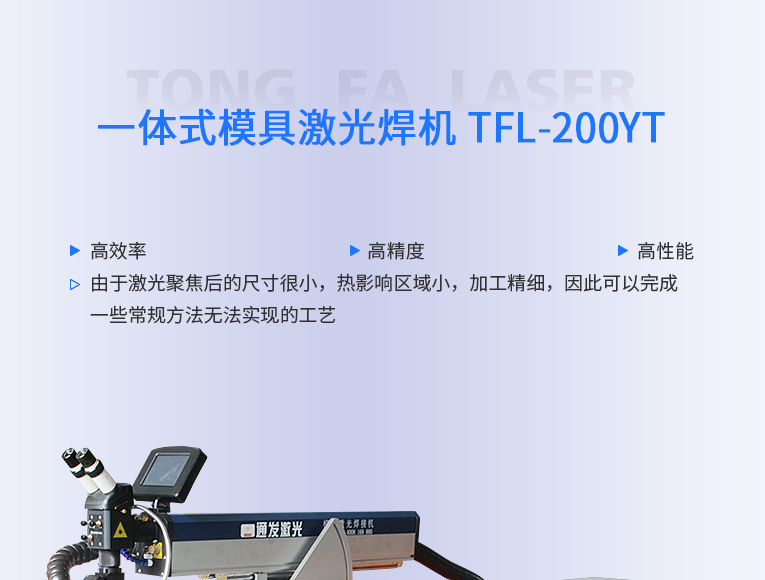 通發激光一體式模具激光焊機TFL-200YT/TFL-400YT是一款多種功能融合一體的新型模具激光焊接機,針對特大型塑料模具激光焊、中型注塑模具激光燒焊、小型塑膠模具激光補焊、壓鑄模激光補焊具等各類模具可實現超精密修復,幫您解決大型汽車模具修復難題,不需要模具移動,電動工作臺與立體旋轉激光頭完美結合,操作桿控制運動移動實現輕松激光修復大型模具,同時也保留了傳統手動工作臺超精密修復模具功能。