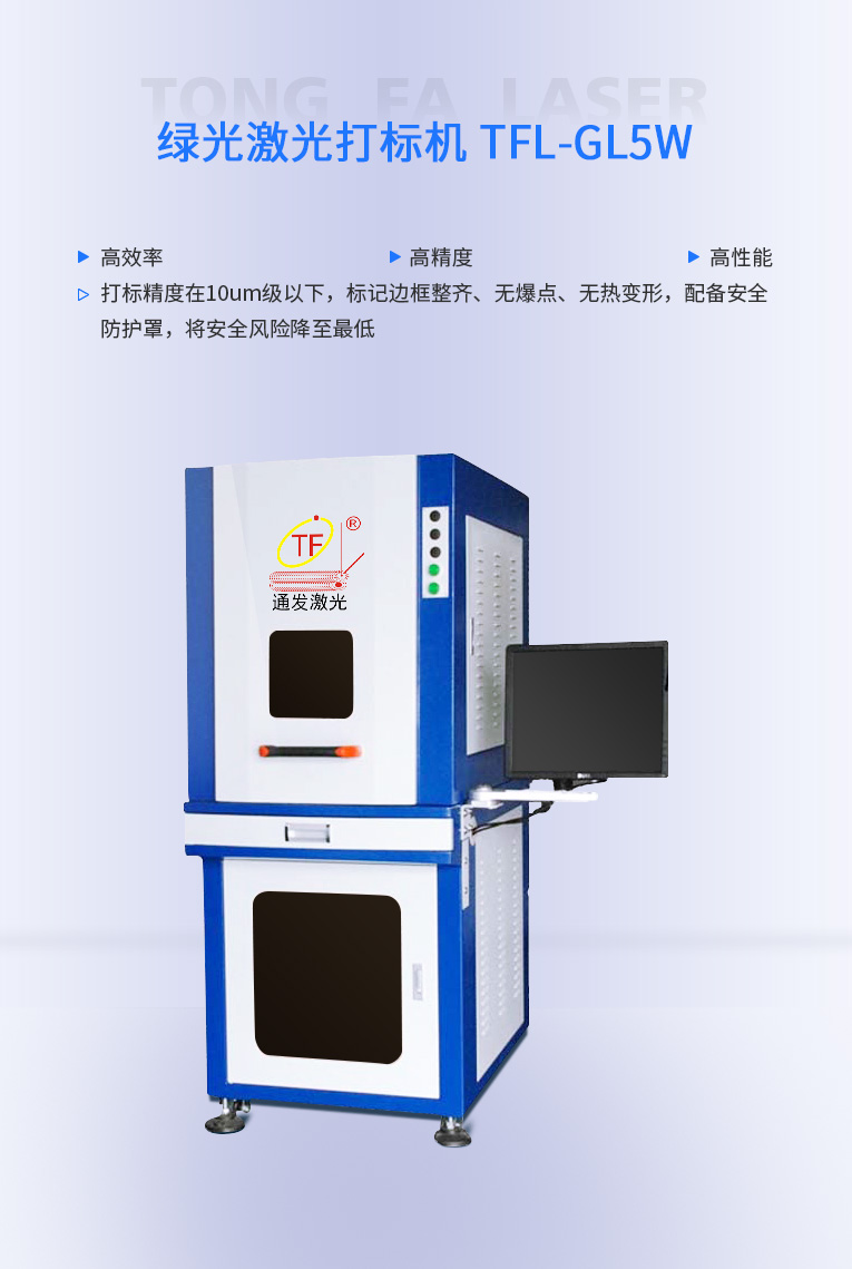 通發(fā)激光研發(fā)的TFL-GL3W/5W 綠光激光打標機配備安全防護罩,避免設(shè)備操作員誤操作引起的人身傷害,將安全風險降至最低,產(chǎn)品遠銷海內(nèi)外.打標精度在10μm級以下,標記邊框整齊、無爆點、無熱變形,有效提高加工的成品合格率,使用壽命長、配合全封密光路、特別加固的光路底座滿足長期、穩(wěn)定性的工作需要。