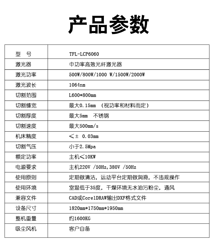 | 激光功率 | 500W/800W/1000 W/1500W/2000W |